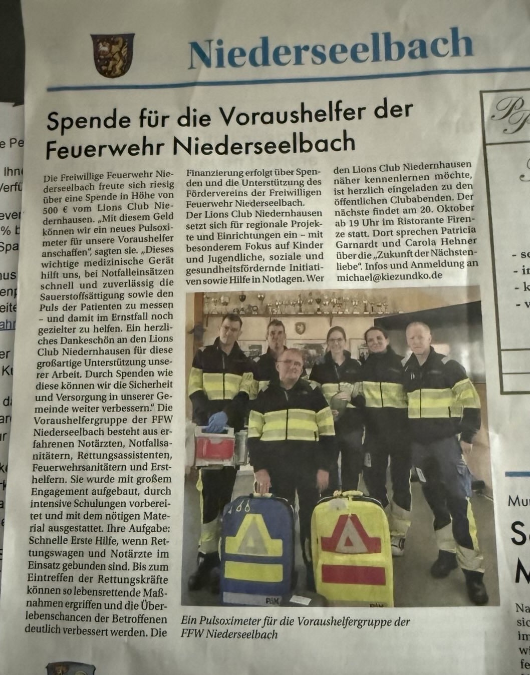 Ehrenamt unterstützt Ehrenamt, und so war es den Niedernhausener Lions ein Anliegen, durch ihre Spende die Anschaffung eines Pulsoximeters zu ermöglichen.