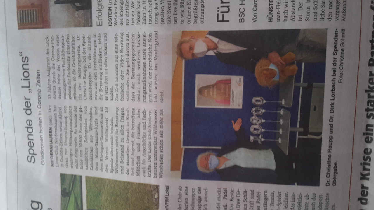 Bei der Übergabe der Spende in den Räumen von Wildwasser Wiesbaden e.V., durch den Präsidenten des LC Niedernhausen, Dr. Dirk Lorbach betonte die Geschäftsführerin der Beratungsstelle, Frau Dr. Christine Raupp, dass das Geld gerade zur rechten Zeit komme, da aufgrund des Lockdowns durch die Corona-Pandemie der Verein seine umfangreichen Fortbildungsangebote für Fachkräfte ganz einstellen musste.
