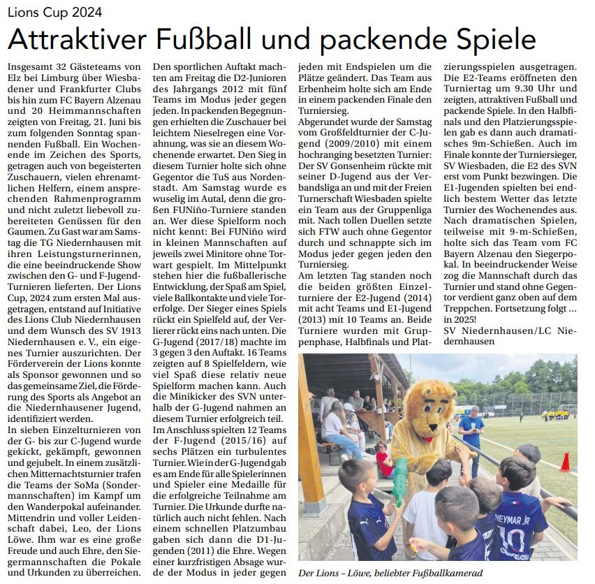 Der Lions Cup, 2024 zum ersten Mal ausgetragen, entstand auf Initiative des Lions Club Niedernhausen und dem Wunsch des SV 1913 Niedernhausen e.V., ein eigenes Turnier auszurichten. Der Förderverein der Lions konnte als Sponsor gewonnen und so das gemeinsame Ziel identifiziert werden: Die Förderung des Sports als Angebot an die Niedernhausener Jugend.